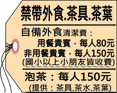 自備茶具組或攜帶外食(包含:茶葉),皆加收清潔費:每人80元 (包含:國小以上小朋友,皆收費)。